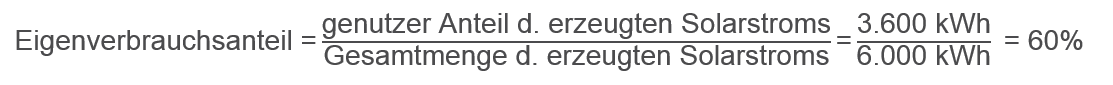 Ein Beispiel: Werden pro Jahr durch die PV-Anlage 6.000 kWh Solarstrom erzeugt und davon 3.600 kWh direkt im eigenen Gebäude verbraucht, so beträgt der Eigenverbrauchsanteil 60 %.